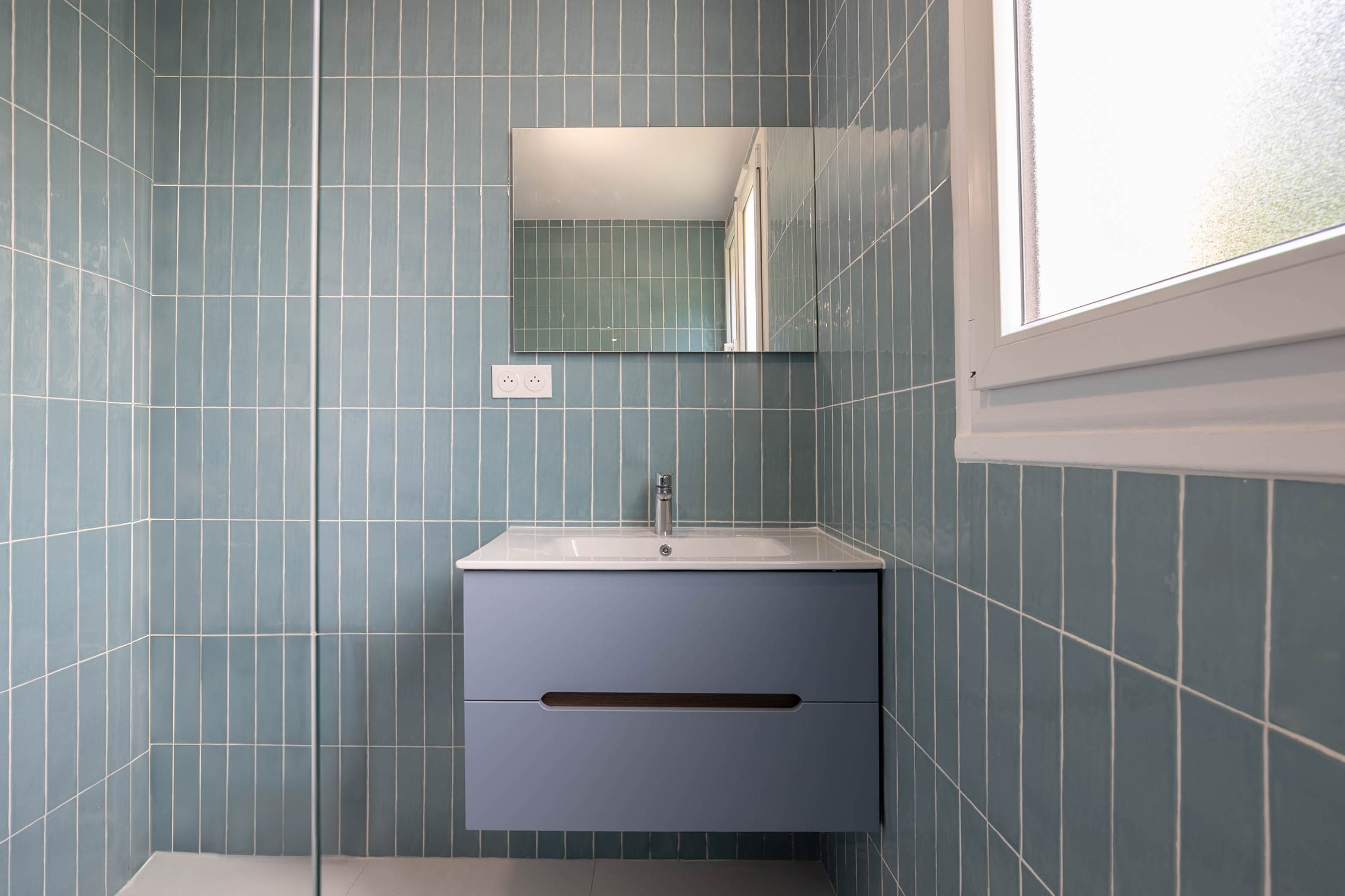 L’installation électrique a été mise aux normes, les espaces optimisés, et les finitions claires et lumineuses ont permis d’agrandir visuellement les volumes.
